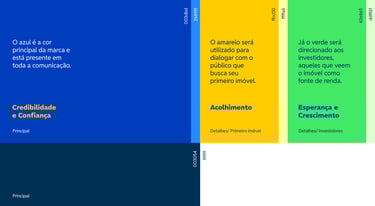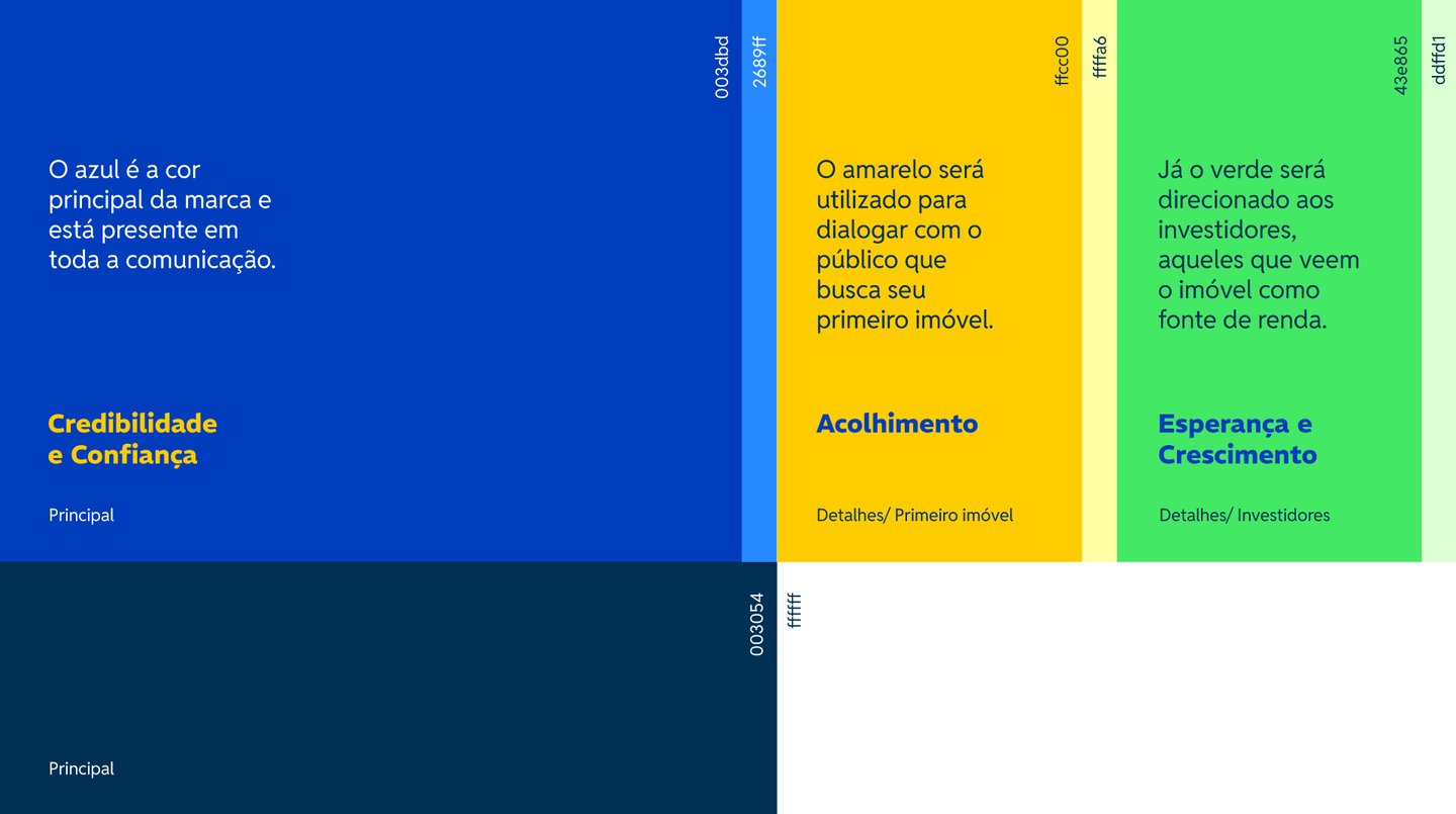 As cores escolhidas desempenham um papel estratégico na comunicação da marca, sendo o azul a cor principal para transmitir credibilidade e confiança. O amarelo foi reservado para o público em busca do primeiro imóvel, com o objetivo de transmitir acolhimento, enquanto o verde foi selecionado para os investidores, simbolizando esperança e crescimento.